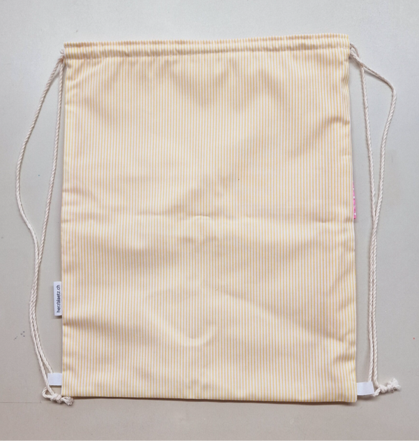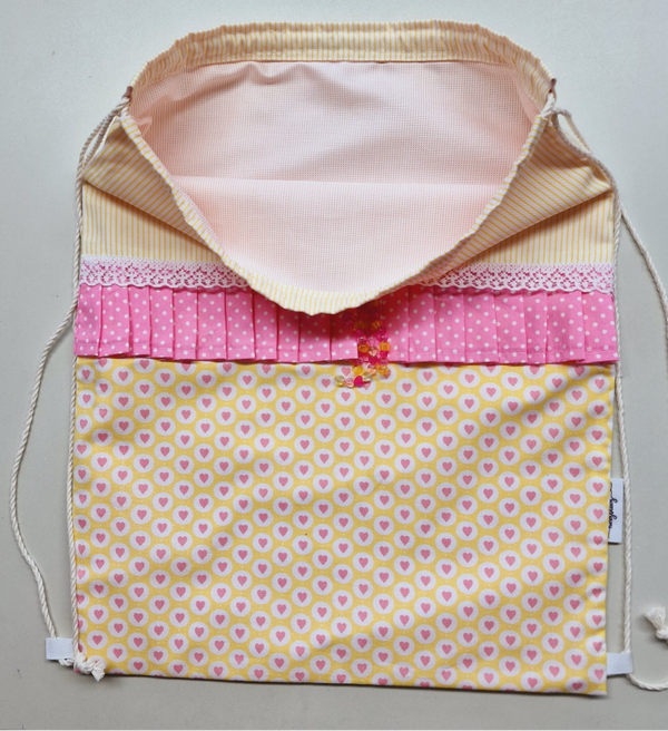 Bag aus Baumwolle mit Innenfutter. Verspielte Stoffe in zartem Gelb und Pink mit "Chräleli" Anhänger und Spitze.